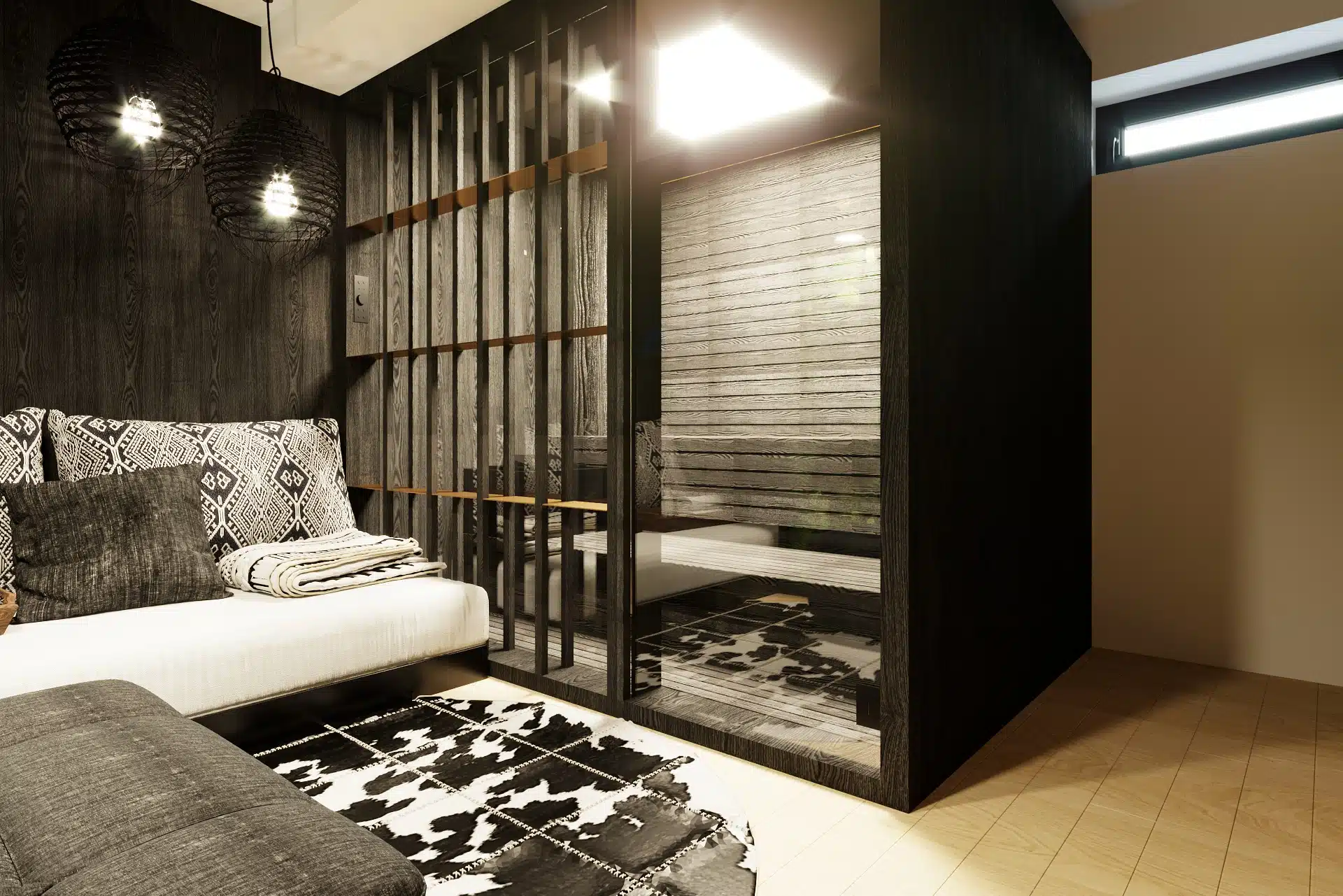 Spodné podlažie domu sme koncipovali s víziou do budúcnosti. Aktuálne slúži ako komfortná hosťovská izba, no v pláne je jej neskoršia premena na detskú izbu. Tento priestor dopĺňa praktický pracovný kút a exkluzívna wellness zóna. Sauna s oddychovou miestnosťou prináša majiteľom luxusný zážitok priamo doma a dotvára tak moderný dizajn interiéru zameraný na pohodu.